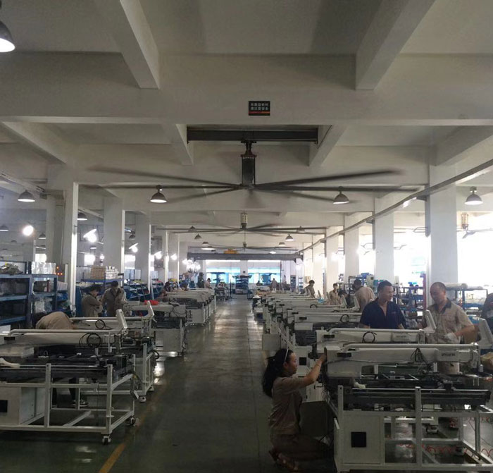我公司生產的大型工業吊扇直接懸掛在廠房屋梁下,風力柔和,能加快車間空氣流通,有效降低車間內溫度,改善車間空氣環境質量,有利于員工的身體健康。